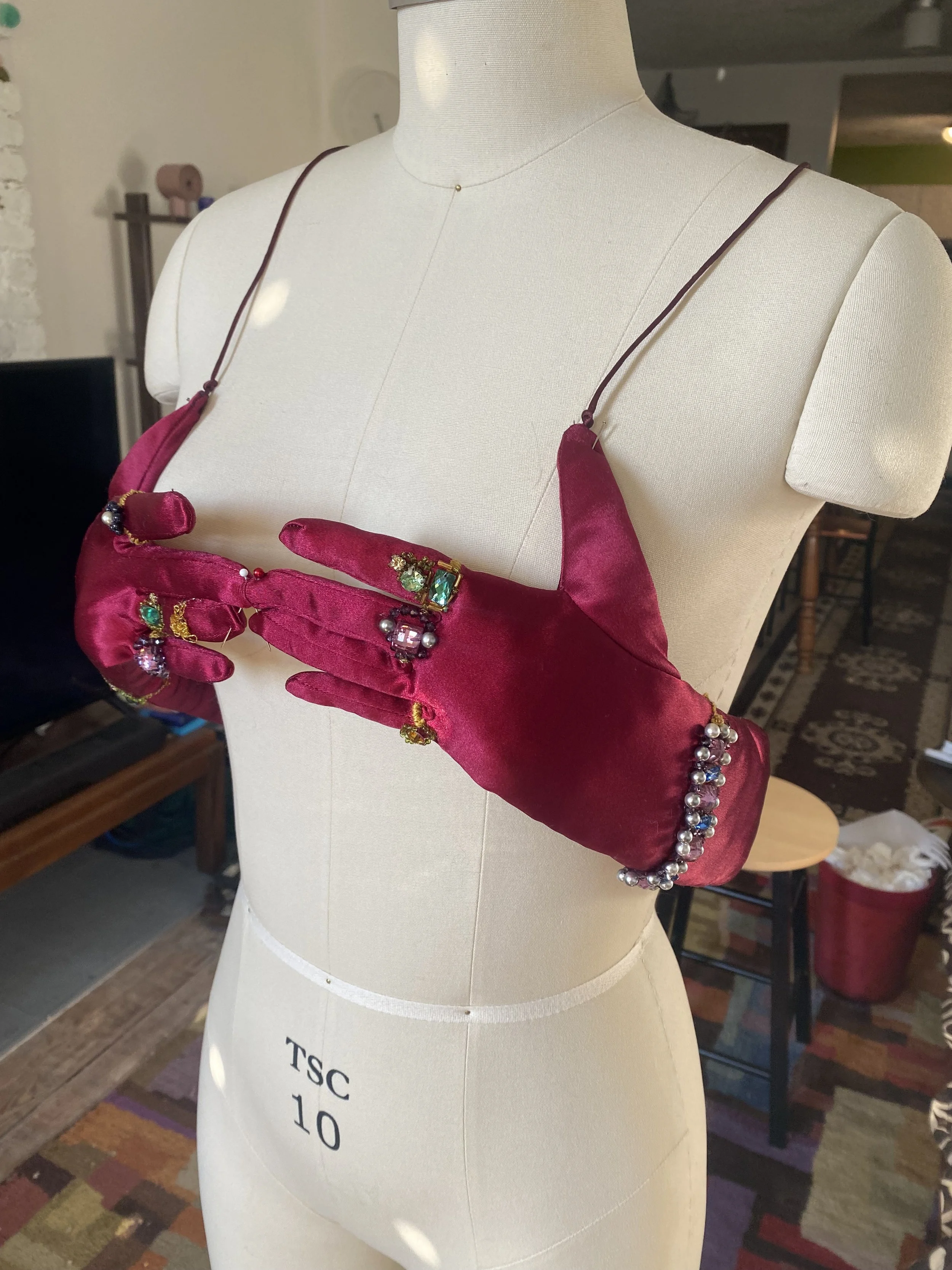 Nylon Gloves, embroidered, beaded, and stuffed with poly fill.